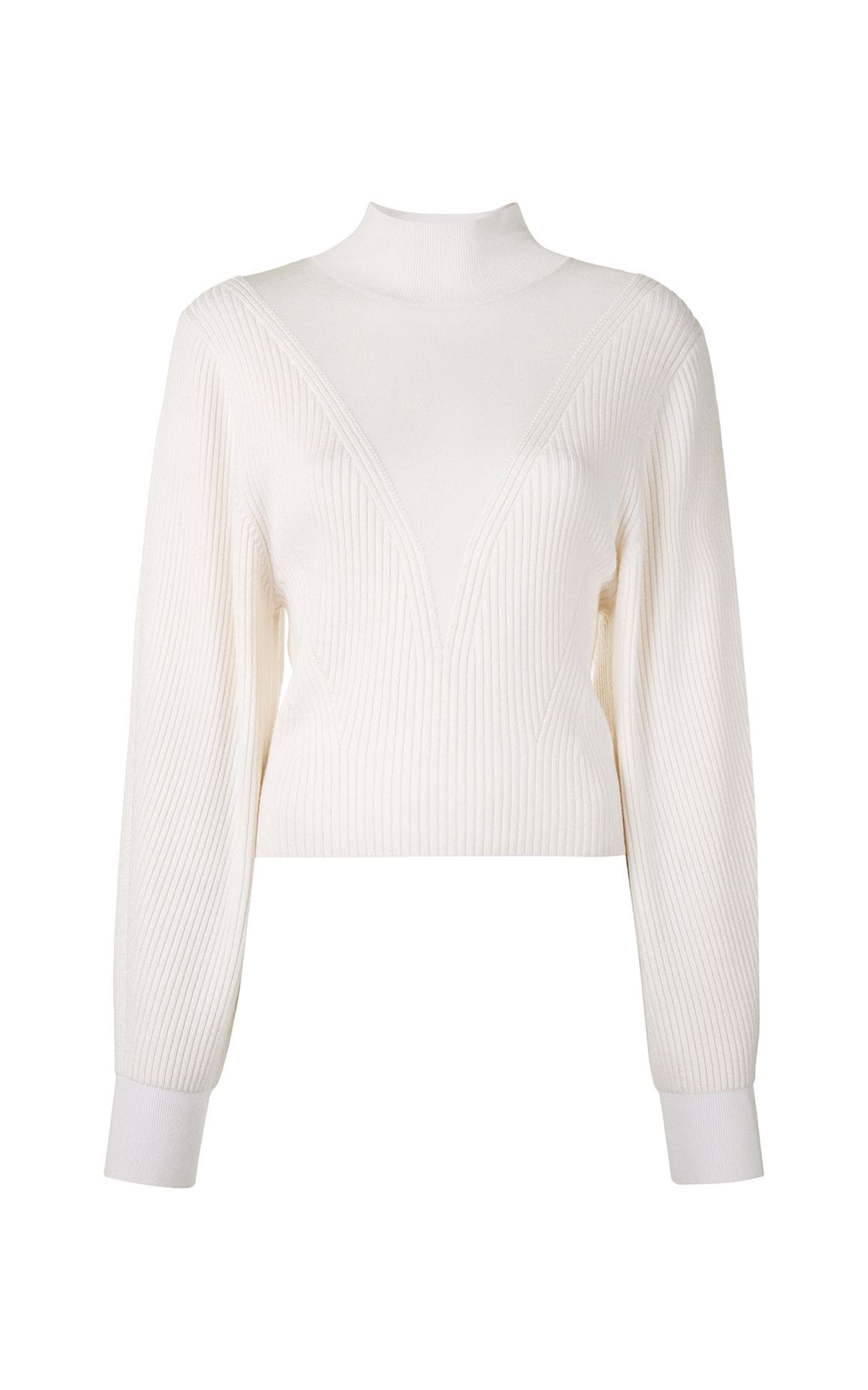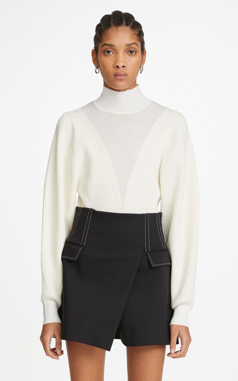 Ultra soft merino ribbed hosiery sweater. Made from heavy weight merino yarn with an elevated knit finish. V-neckline created through opaque and sheer panels. Oversized sleeve cinches in at the wrist.
