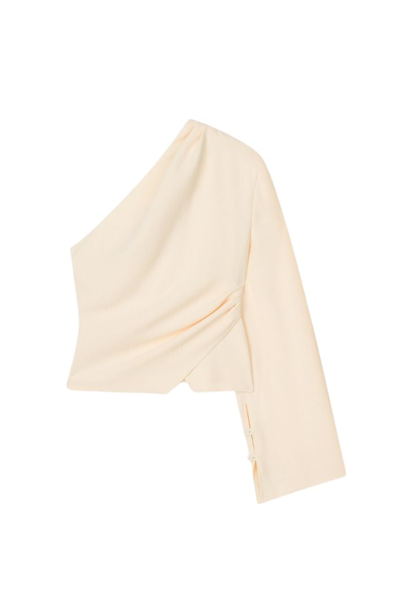 A simple style which cuts a dramatic silhouette, the Laurine top instils an effortless elegance for evening. An asymmetric one-shoulder cut is enhanced with softly draped contouring and a button split flared sleeve. Our vanilla boucle crepe fabric plays a starring role.