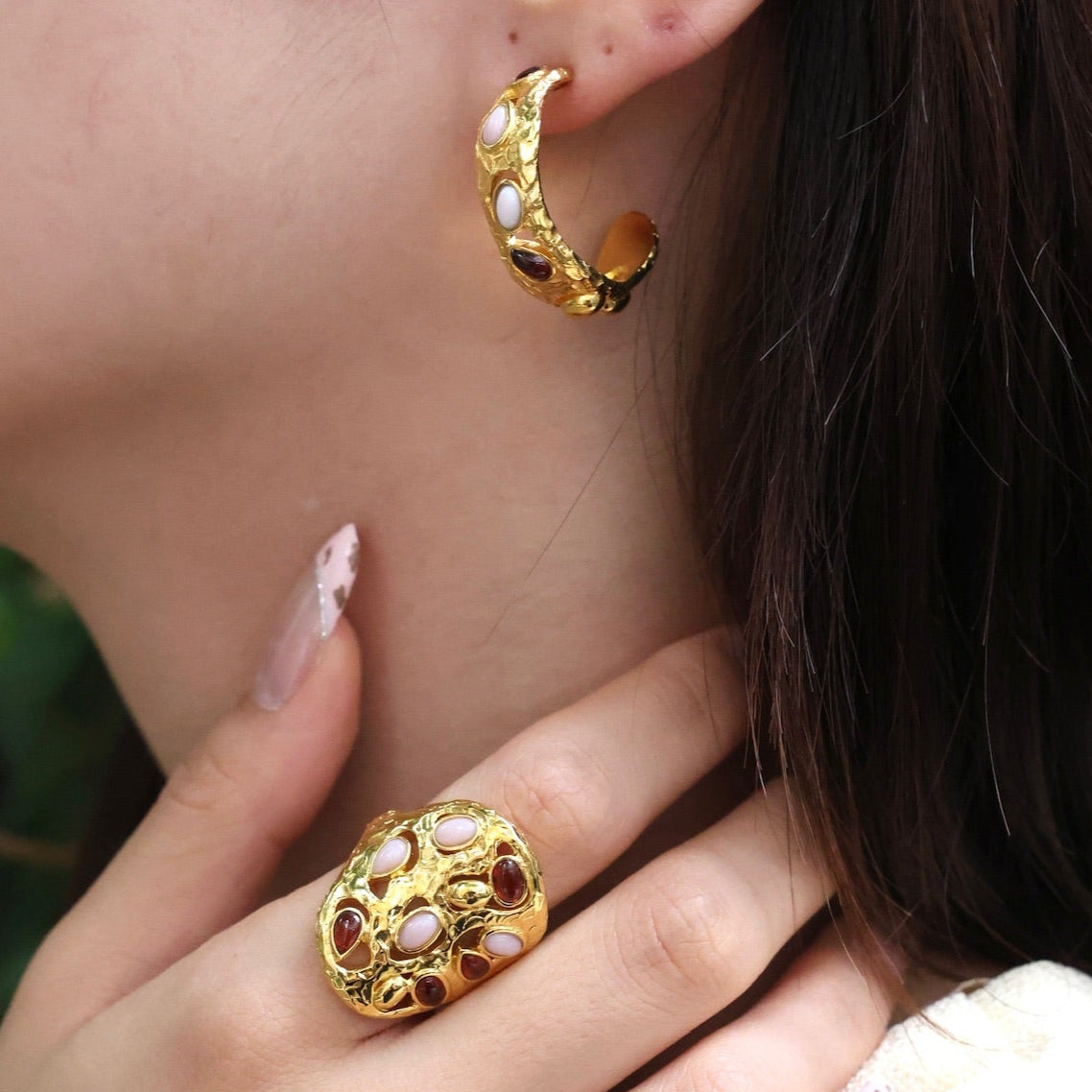 The Atalide Wide Ring by Aurelie Bidermann makes a bold sculptural statement. Featuring richly hammered gold plating and juicy gemstone cabochons, it's a tactile, artful accent.