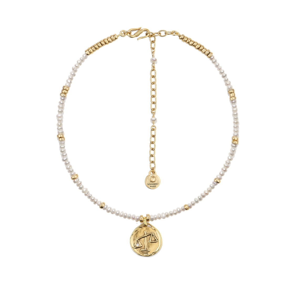 Astro Libra Pearls Necklace by Goossens with its Astro Libra medallion, made of freshwater pearls, is available in all zodiac signs and complements the existing line. Perfect for layering with longer necklaces, such as those from the Astro collection.