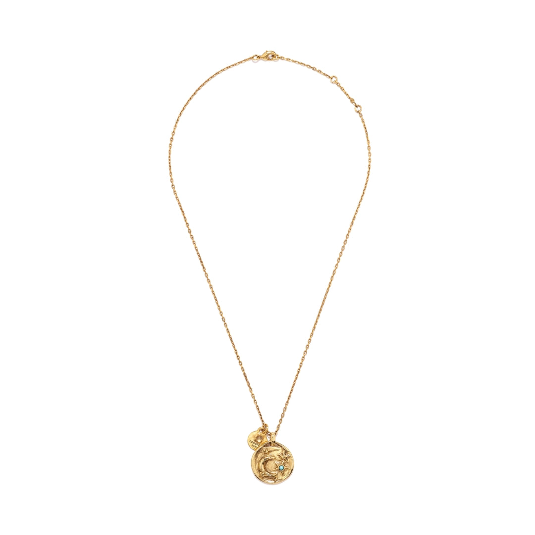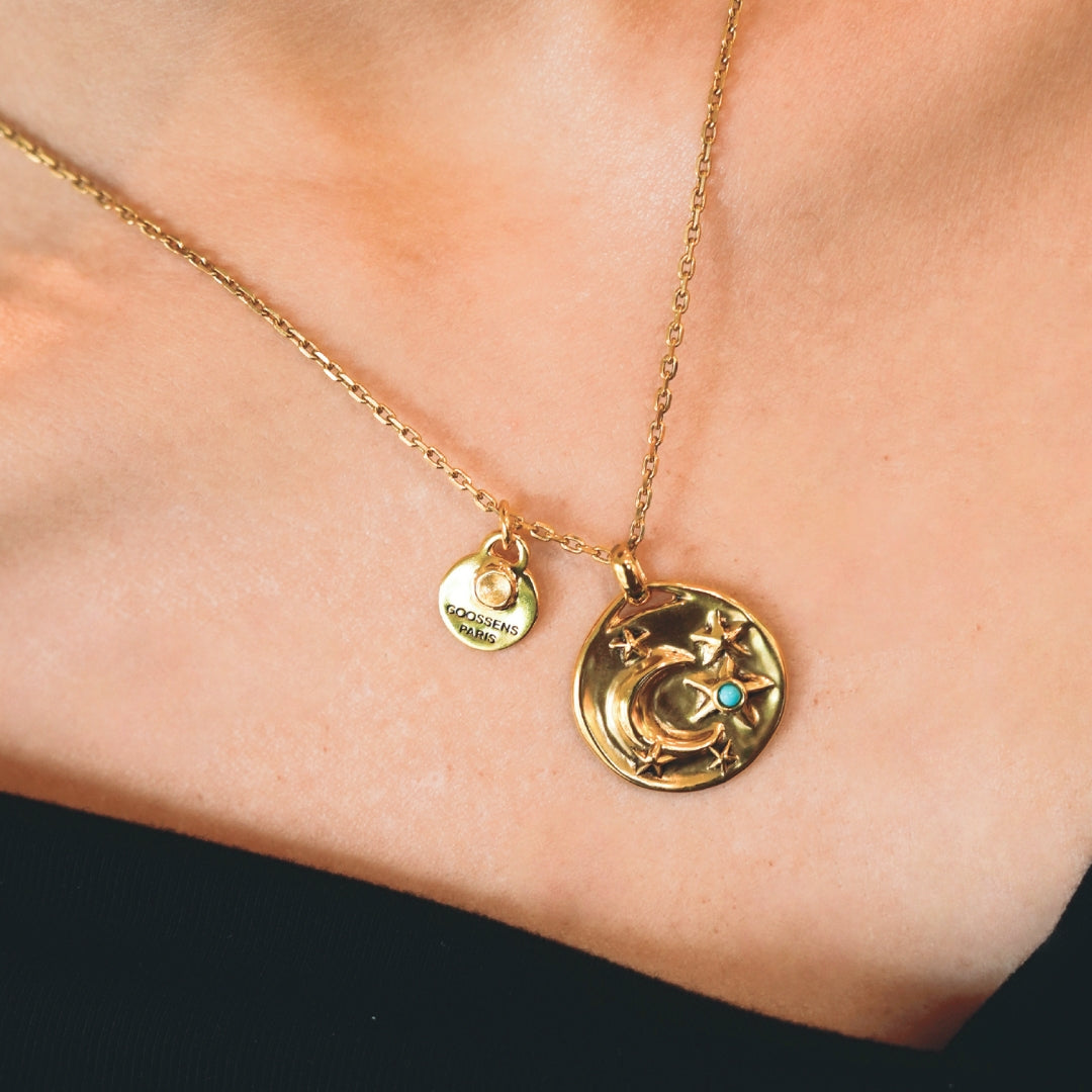 Astro Moon Thin Necklace by Goossens exquisite piece features a beautifully crafted gold moon design, embellished with shimmering stars and a captivating gemstone. Ideal for layering or as a standout accessory, it brings celestial charm to any ensemble. Elevate your jewelry collection today!