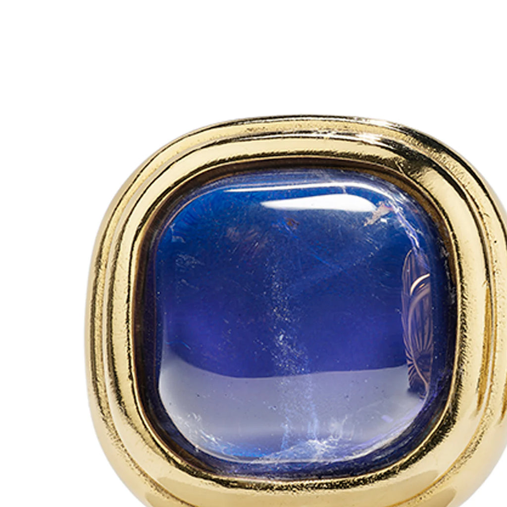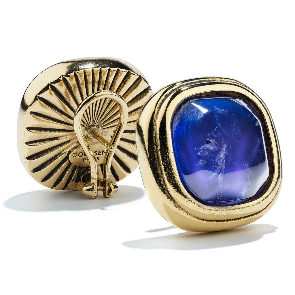Renaissance Stud Earrings (Ultramarine Blue) by Goossens. A modern take on Renaissance elegance, these stud earrings center around tinted rock crystal framed by brushed gold-toned metal.