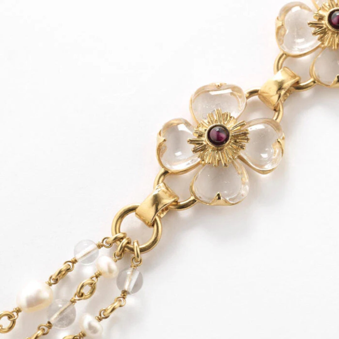 Clover Long Necklace Natural Rock Crystal by Goossens A precious, poetic version of the lucky clover, carved in the shape of a heart and set by hand. Yellow gold finish. Natural rock crystal and freshwater pearl. A natural treasure.