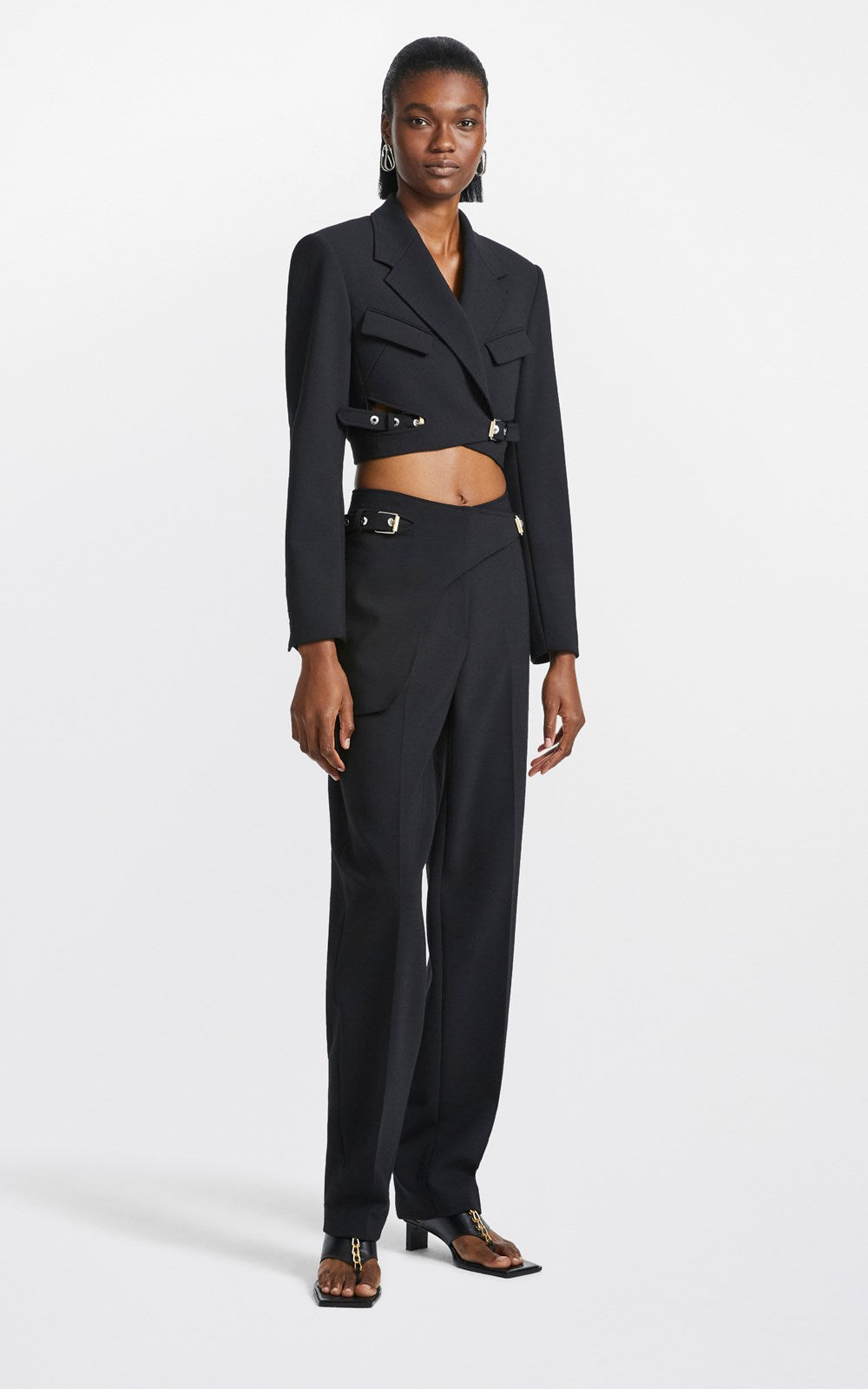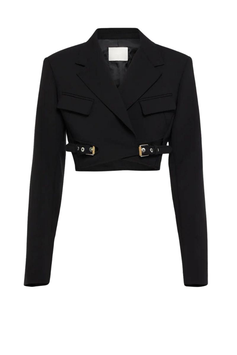 Cropped wool-blend blazer with interlocking pin-buckle belts at front hem. Detailed with silver-tone logo-engraved eyelets and belt loop. Notch lapel collar and offset flap pockets at bust. Padded shoulders and full length sleeves with four-button cuffs. Cut for a tailored silhouette from a luxurious lightweight wool-blend fabrication. Blazer is fully lined. Style with Interlock Blazer Skirt or Saddle Interlock Trouser in coordinating colourway.