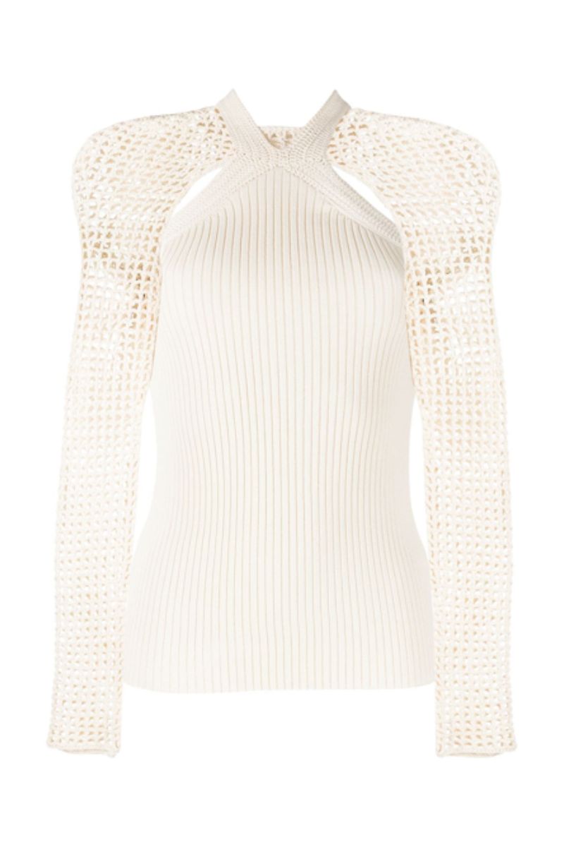 Two-piece long sleeve unisex crochet knit top. Featuring a stretch rib halter tank top detailed with a hand-applied crochet stitch binding and bolero sleeve. Knitted from a soft viscose-blend yarn for a slim and comfortable fit. Style pieces as a set or wear individually.
