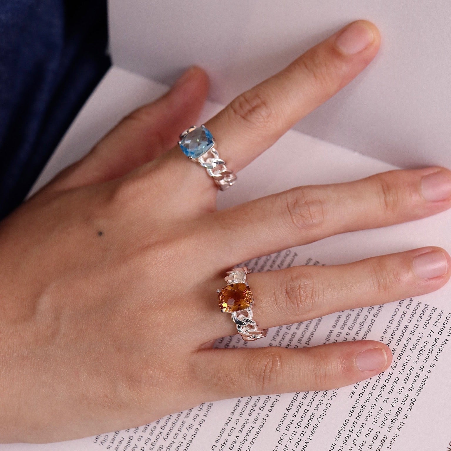 TheTopaz Stone Cuban Ring by LOUVE features a stunning cushion-cut topaz stone set against a bold Cuban link band that adds a touch of modern flair. The radiant blue hue of the topaz captures light beautifully, making it a striking focal point. Its unique design allows it to stand out on its own or be layered with other rings for a personalized look. Elevate your jewelry collection with the LOUVE Topaz Stone Cuban Ringwhere timeless beauty meets modern sophistication.