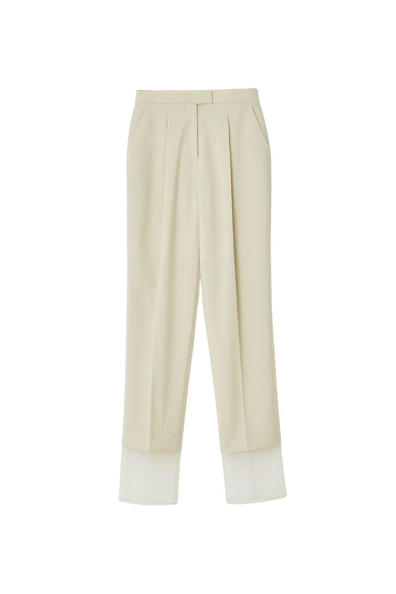 It features organza details layered on the hem. The seam is finished with a loose finish, making it a neat and solid finish. Double fastening is possible with an inner button, and a mechanical hook is used to enhance the completeness. It is made exquisitely and luxuriously by attaching shoulder straps to the waist. This is a 21SS V-NECK LAYERED BLAZER and setup product.