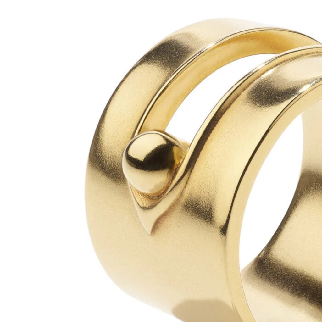The ring is crafted from brass, which is then soaked in a 24-carat gold bath, giving it a beautiful yellow gold color. With its sleek and modern design, the Boucle Ring is the perfect accessory to add a touch of refinement and style to any outfit.
