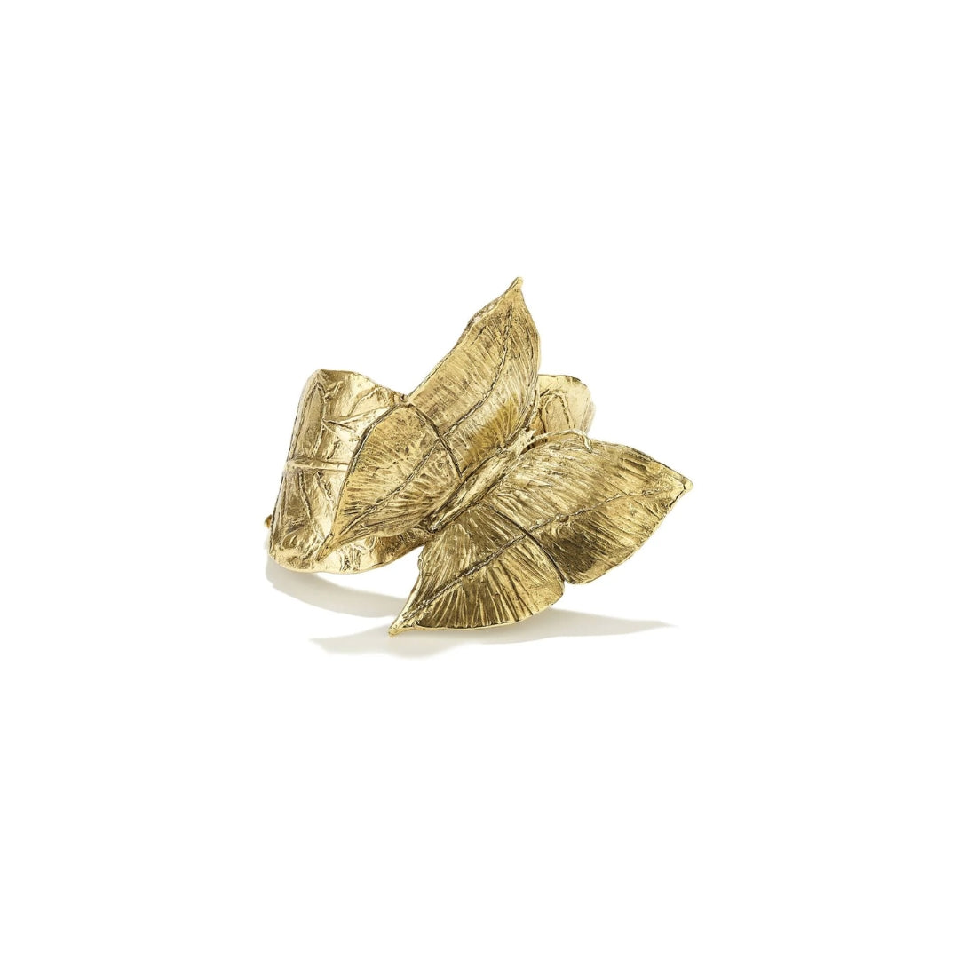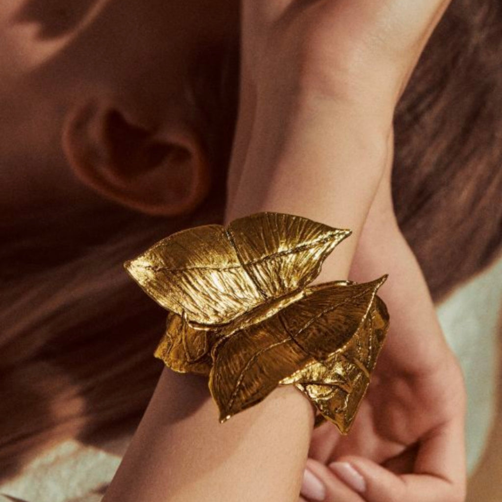 Harumi Butterfly Bracelet embraces a unique creative freedom, striving to connect the realms of humans and plants. This collection features the Kallima inachus leaf butterfly and dragonfly, showcased in a stunning golden finish. A bracelet captures the essence of this extraordinary lepidopteran, which camouflages itself as a dead leaf, reminding the wearer to embrace curiosity and audacity.