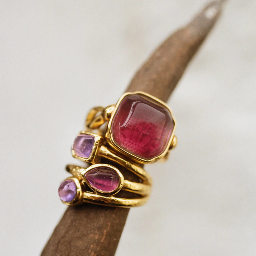 Mini Cabochons Ring by Goossens Paris features rock crystal drops in various shapes and sizes. The collection playfully explores the shades of rock crystal, offering a vibrant palette of colors, sometimes in monochrome and other times multicolored.