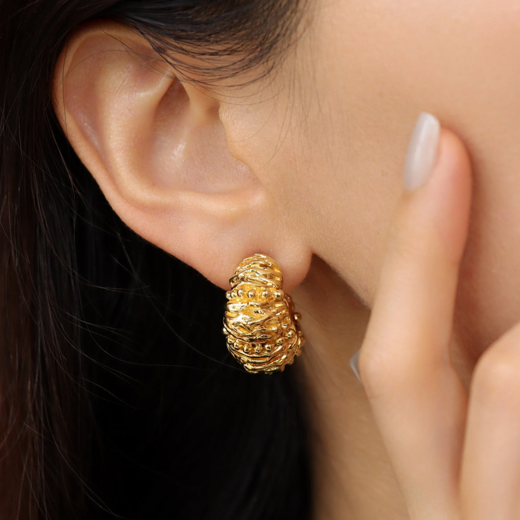 Cloe Medium Hoops from Paola Sighinolfi. These exquisite hoops are meticulously crafted from 18k gold plated pewter metal, combining timeless elegance with a contemporary twist. The medium size makes them the perfect balance between bold and understated, allowing you to wear them effortlessly from day to night.