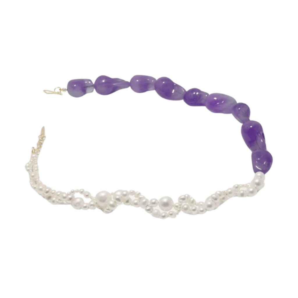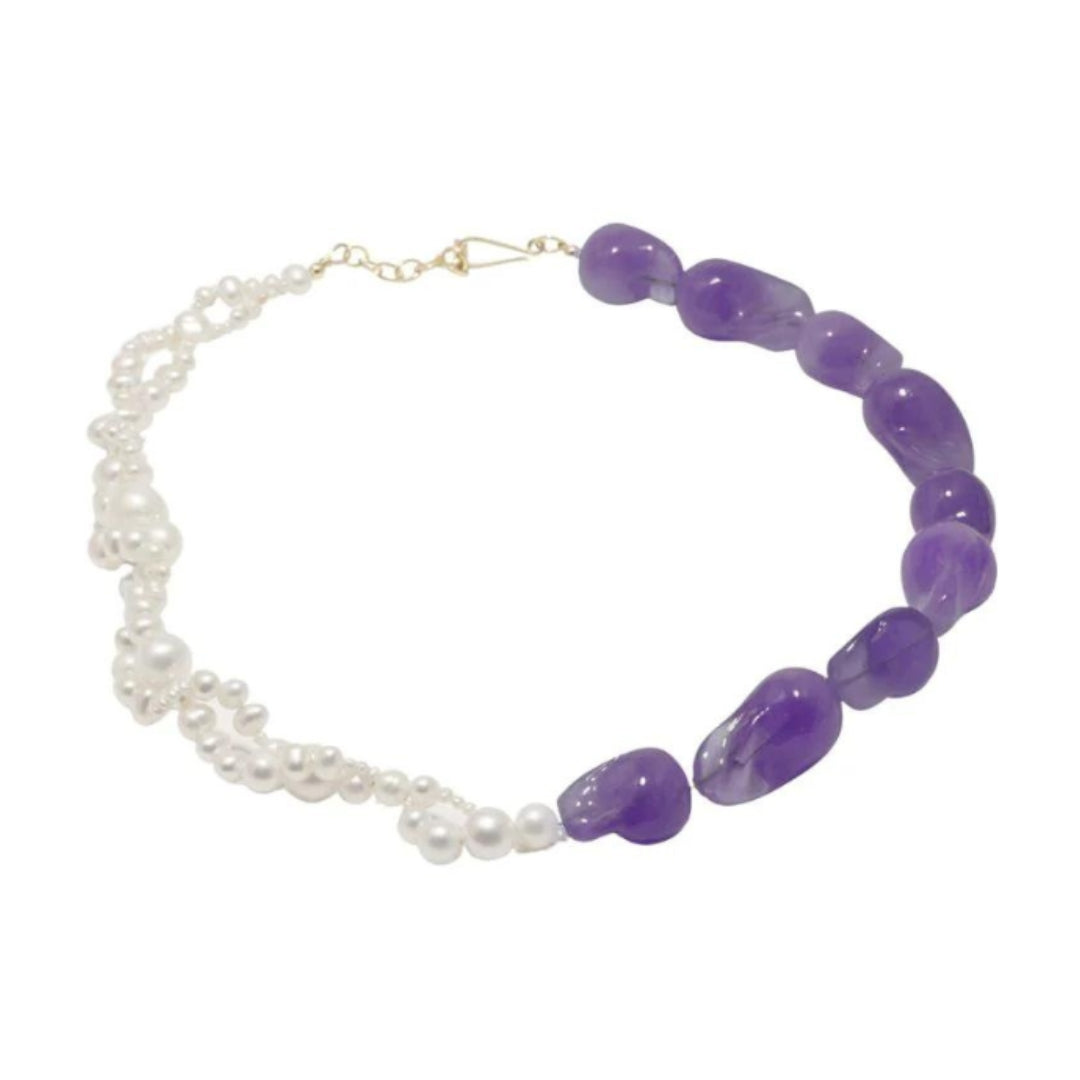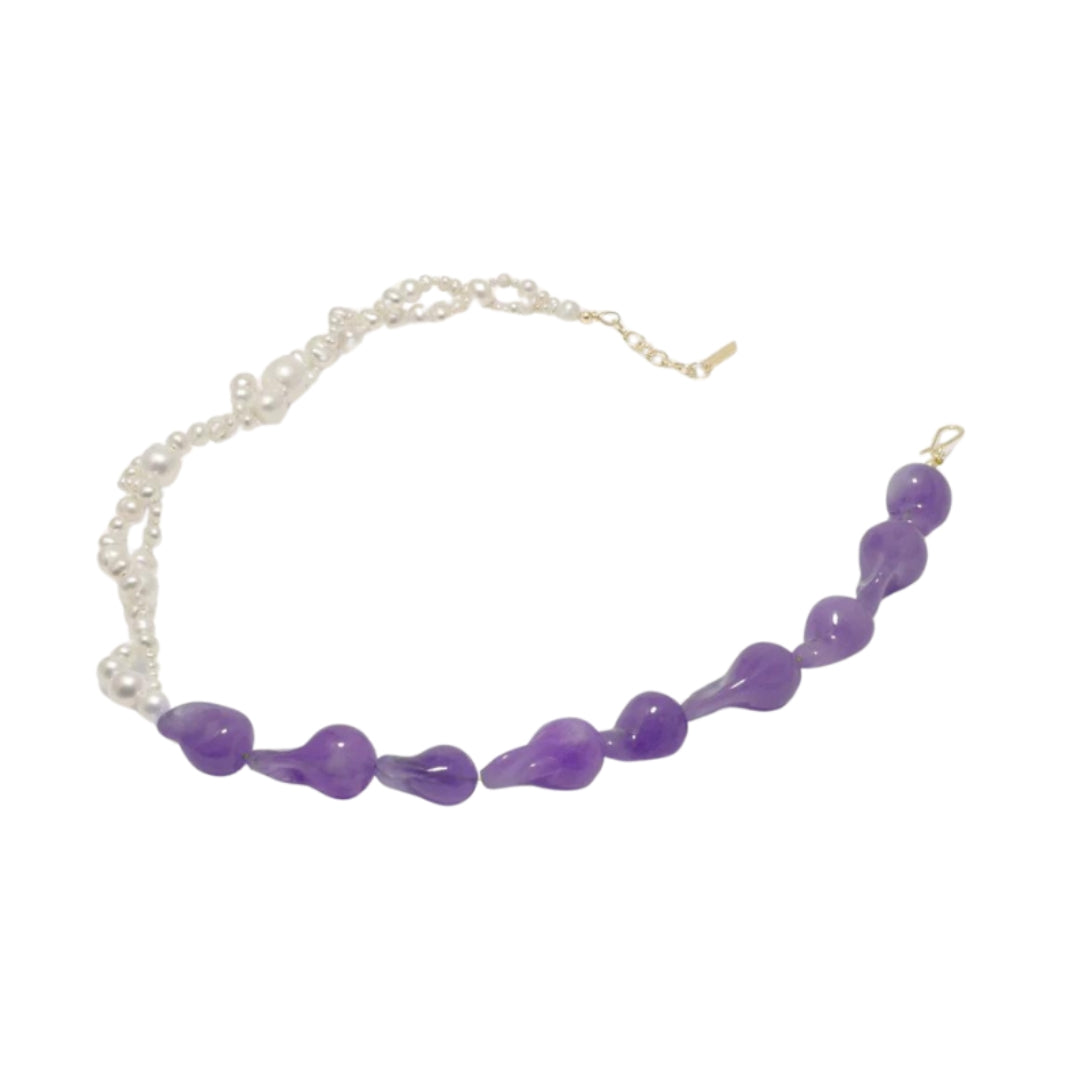 Parade of Possibilities II Pearl and Lilac Resin Gold Plated Necklace from Completedworks features a resin pendant that captures the essence of the ocean, with swirling blue and white reminiscent of the tides. The pearls introduce a timeless elegance, while the gold-plated chain adds a touch of modern sophistication.