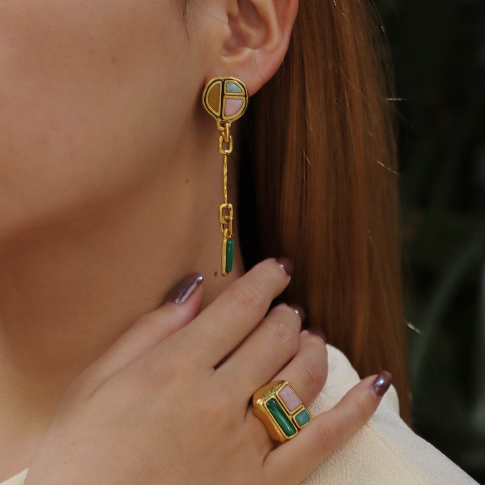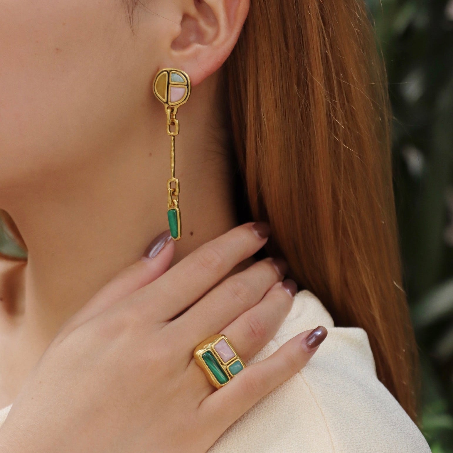 Sagane Ring from Aurélie Bidermann. Inspired by Saint-Tropez’s artist village, this ring showcases a vibrant mosaic of amazonite, malachite, and pink opal—like wearable art for day-to-evening elegance.