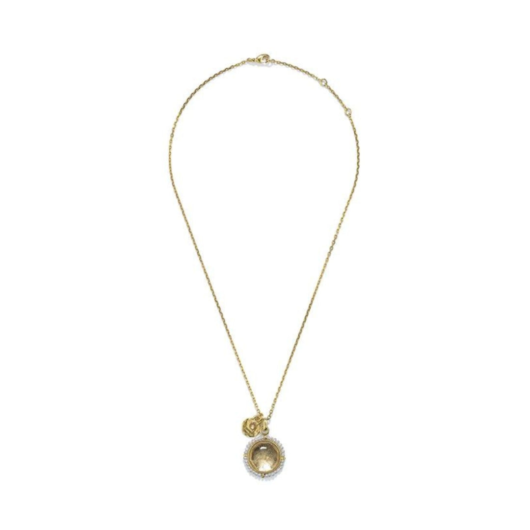 Talisman Crystal & Pearls Charms Necklace by Goossens showcases the rich heritage of the Maison, featuring recurring themes like wheat, corals, four-leaf clovers, and zodiac signs. With our 'Bar à Talisman,' you can personalize your necklace by pairing it with your choice of pendants. This stunning piece features a rock crystal cabochon medallion, crafted in brass and elegantly coated in a 24-carat gold bath. Adorned with exquisite freshwater pearls, this necklace combines beauty and meaning, making it a cherished addition to your jewelry collection.